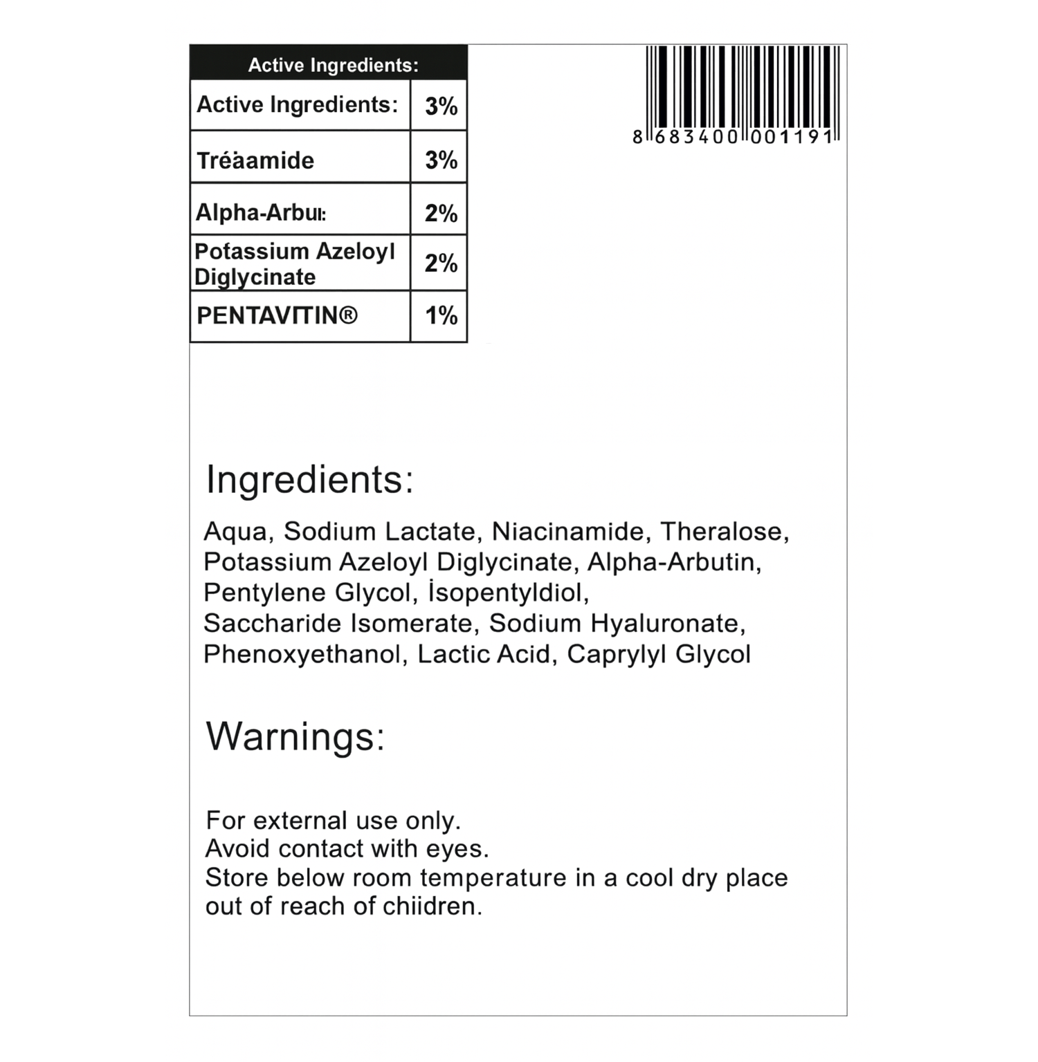 Aqua, Sodium Lactate, Sodium Hyaluronate, Alpha-Arbutin, Dimethyl Sulfone, Phenoxyethanol, Lactic Acid, Caprylyl Glycol