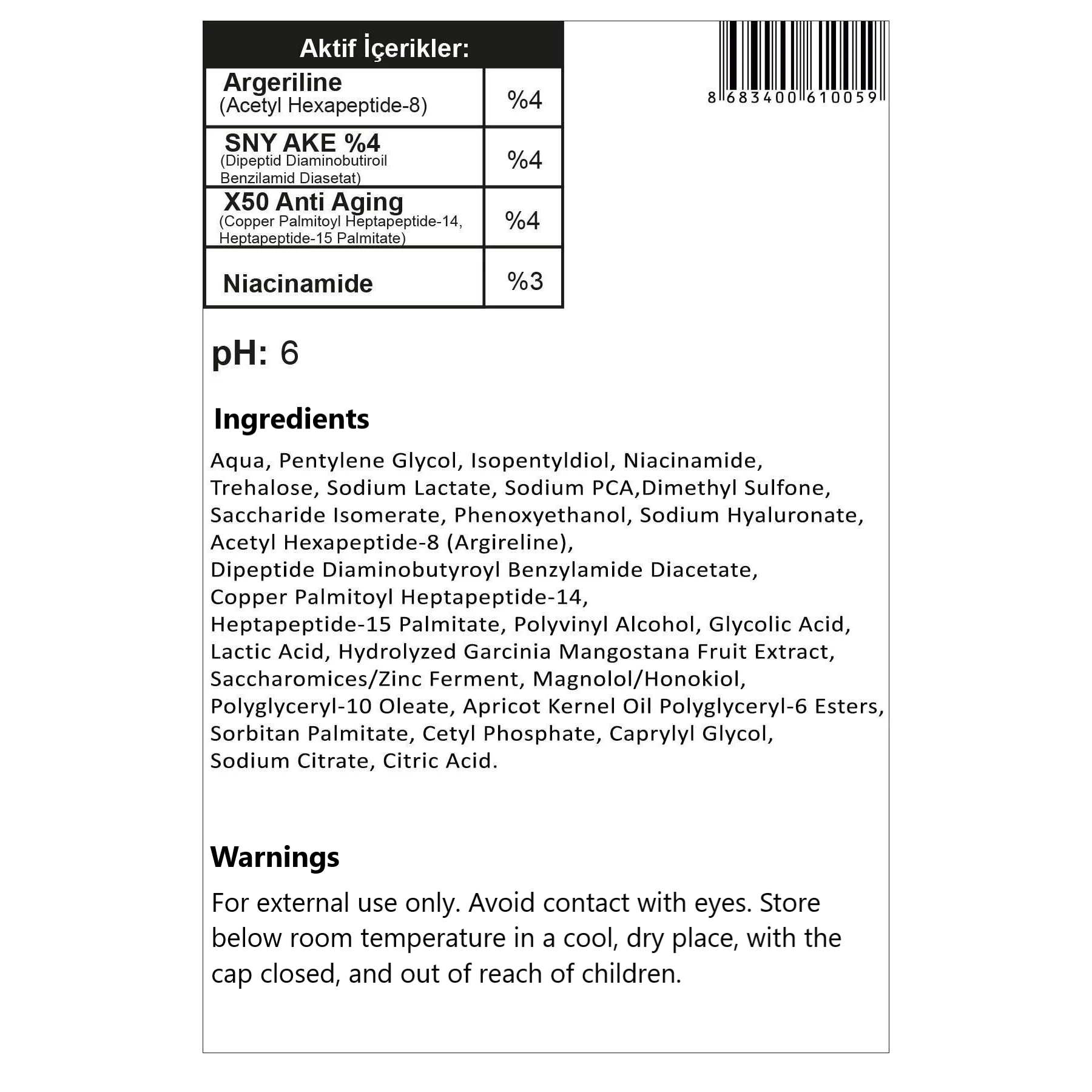 Peptide serum, thanks to the peptides, vitamins, and moisturizers it contains, provides intense hydration to your skin, helps increase skin elasticity, and supports reducing the appearance of wrinkles.